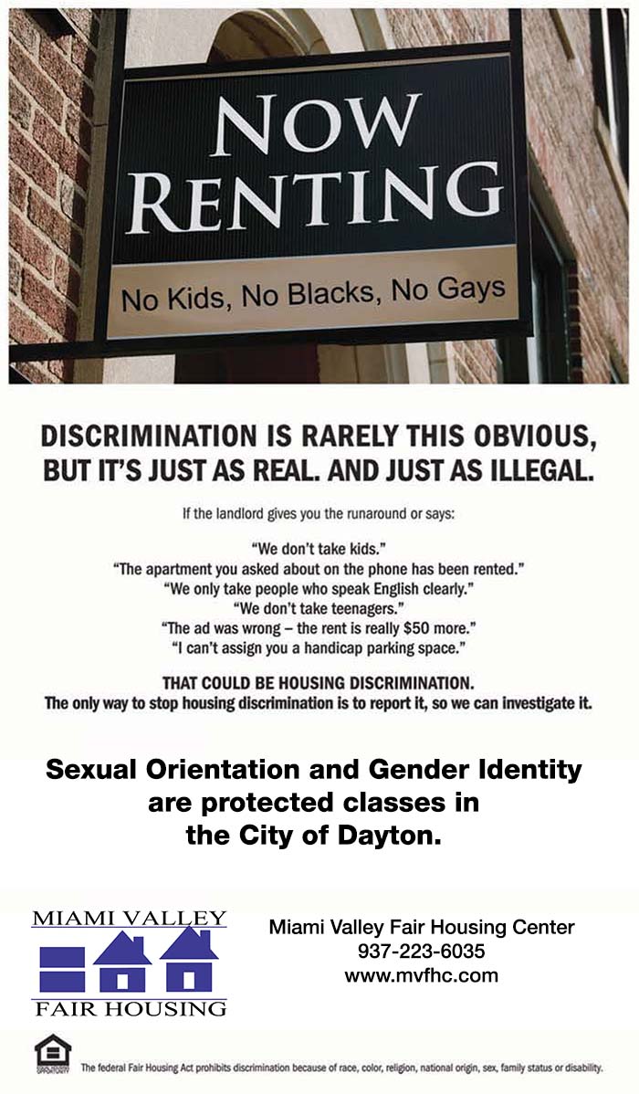 If you believe you have experienced or are about to experience housing discrimination, contact MVFHC for assistance by calling us at 937-223-6035 or by filling out our online housing discrimination complaint form. We will listen to your experience, evaluate your case and inform you of your rights and options. The City of Dayton protects sexual orientation and gender identity, as do some other cities around Ohio (see table at bottom of page). In addition, the U.S. Department of Housing and Urban Development (HUD) has issued regulations to ensure equal access of LGBT persons to housing provided with HUD funding or with loans insured by the Federal Housing Administration (FHA) as well as to loans provided by FHA-insured lenders. For more information, visit HUD’s LGBT page, which has a fact sheet, flyers and a webinar. Also see this 2/23/2015 HUD memo offering guidance on sexual orientation and gender identity in FHA-insured mortgages as well as on appropriate placement for transgender persons in homeless shelters. | Ohio LGBT Protections and Amenities by Jurisdiction |